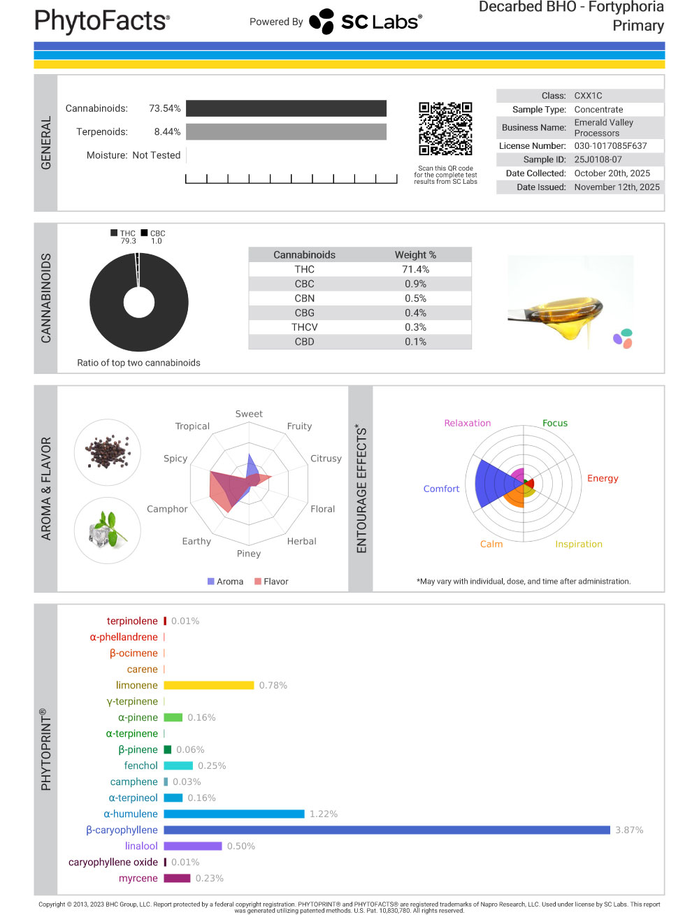 The Smells: Fortyphoria is one of the more terpene rich dabs our lab rats have created at 7.38% total terpenes. As with most dabs, sitting in the driver’s seat is Beta-caryophyllene at 3.62%.