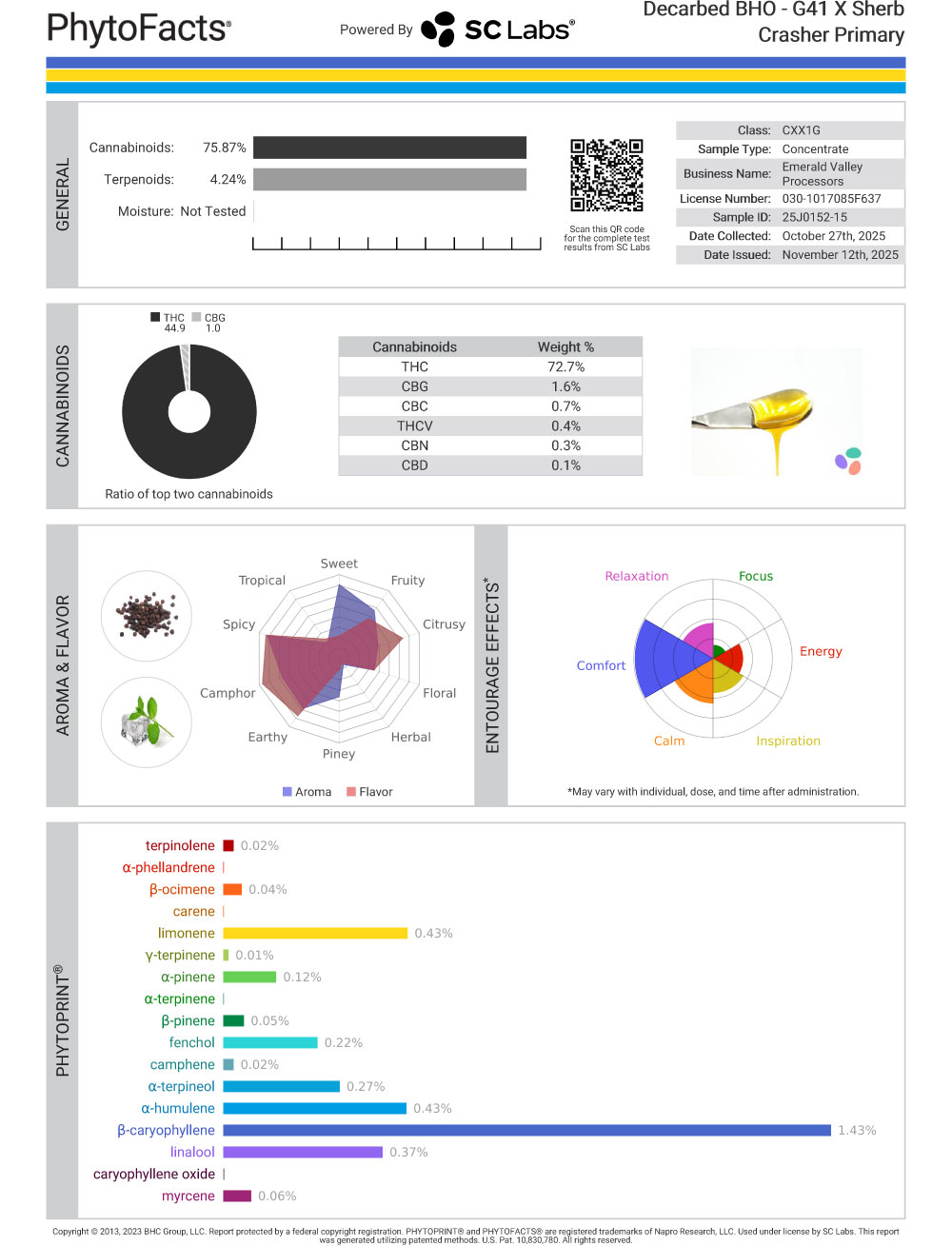Overall, with 75% total active cannabinoids and 4.24% terpene content, G41 X Sherb Crasher by The Dope Depot behaves exactly like the PhytoFact sheet numbers suggest. The terpene profile leans heavily on caryophyllene and humulene for structure, with linalool and terpineol adding a soft, slightly creamy character that keeps it from feeling too dry or one-dimensional.