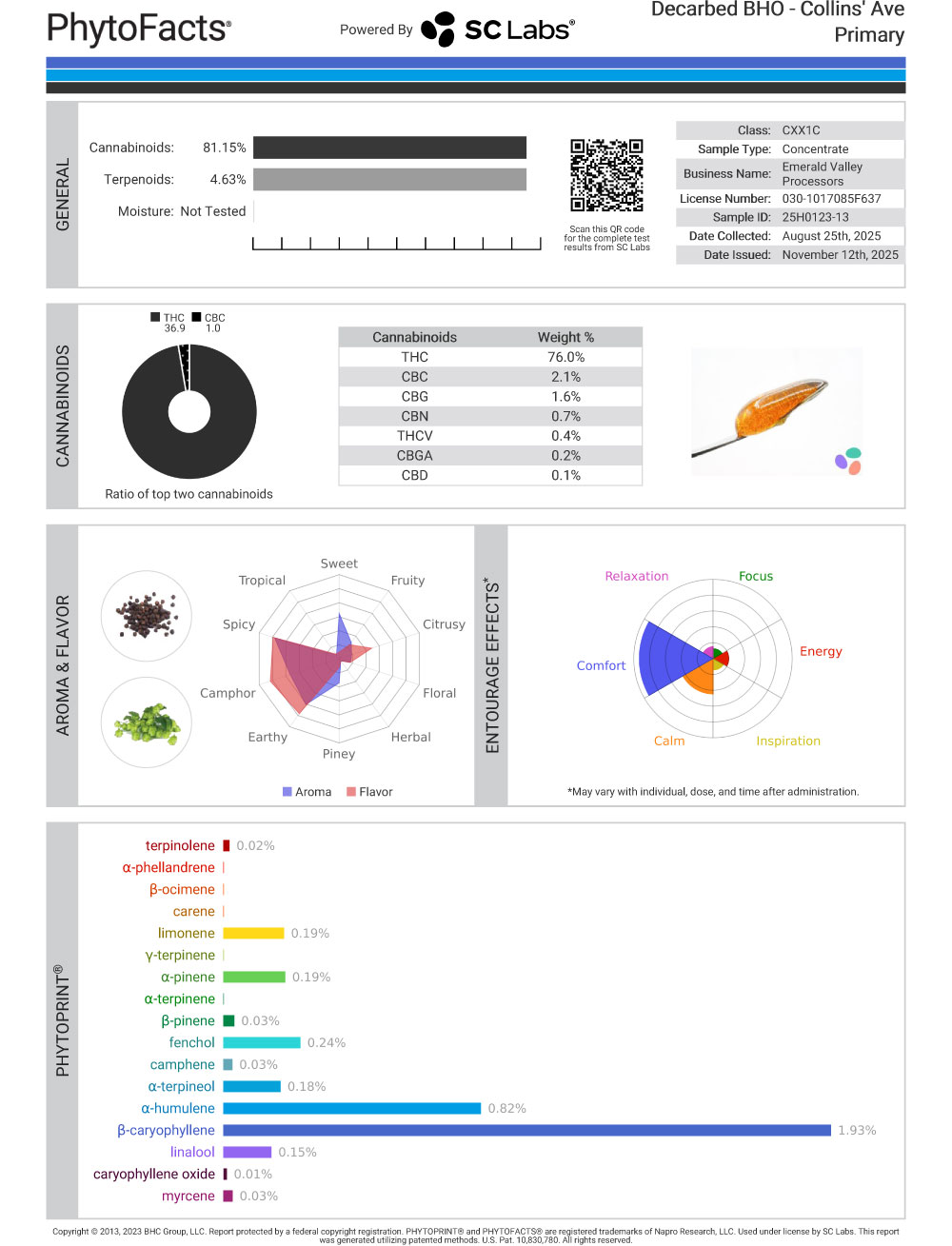 Overall, with 81% total active cannabinoids and 4.63% terpene content, Collin’s Ave by The Dope Depot is a structure-first cart. It leans heavily on caryophyllene and humulene to define the experience, with just enough minor terpene support to keep it from feeling flat.