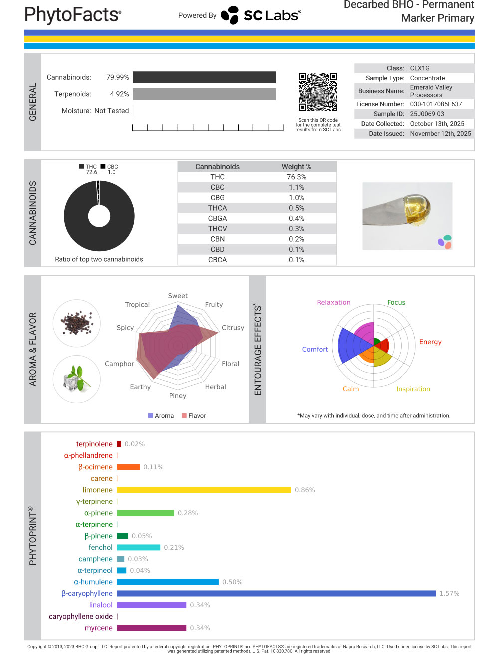 You’ve got a little citrus brightness, a little floral softness, and spicy earthiness all coexisting, and none of them completely hijack the profile. From a data perspective, it lines up with what tends to produce a more complete experience. With multiple terpene classes represented, meaningful mid-tier terpene content, and minor cannabinoids still present, this is a well rounded cart.
