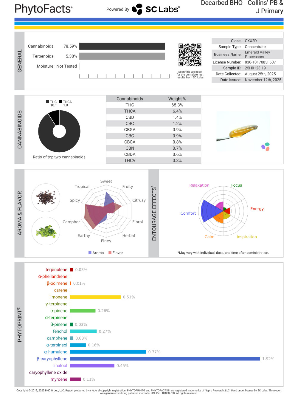 Overall, with 78% total active cannabinoids and 5.38% terpene content, Collins PB & J by The Dope Depot has a profile that reflects a balanced, structure-first approach. Caryophyllene and humulene dominate the terpene stack, giving it an earthy, slightly dry backbone, while limonene and linalool add just enough brightness and sweetness to keep it approachable.