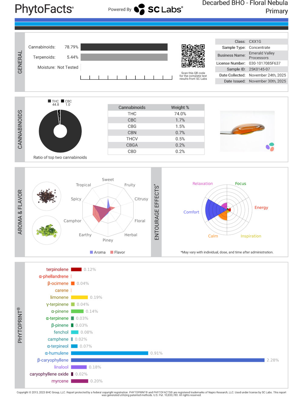 Caryophyllene and humulene dominate the structure, while the lighter floral and citrus terpenes add nuance instead of taking over. It’s a controlled profile that doesn’t overreach.