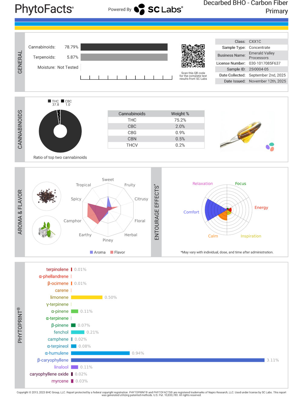 The Tastes: As reported by our lab rats, and the PhytoFact sheet by SC Labs, beta-caryophyllene shows up at 3.11% and does the overwhelming majority of the work here. That’s a pretty comfy number for a cart, and it dominates everything. Expect heavy pepper, dry spice, and a slightly woody, almost abrasive bite.