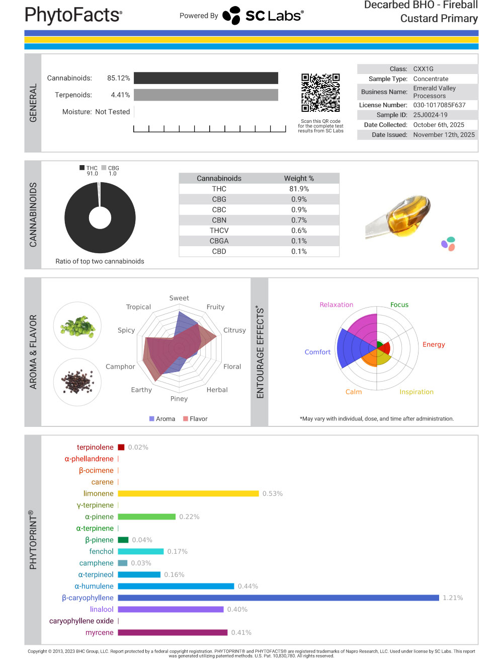 Overall, with 85% total active cannabinoids and 4.41% terpene content, Fireball Custard by The Dope Depot is a solid example of a blend that’s trying to walk the line between approachable flavor and structural terpene integrity.