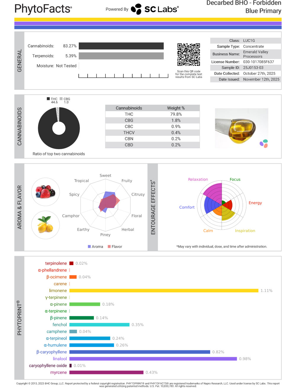Beta-caryophyllene at 0.82% anchors everything with a mild peppery backbone. It’s not dominant, but it’s enough to keep the profile from drifting into sugary nonsense.