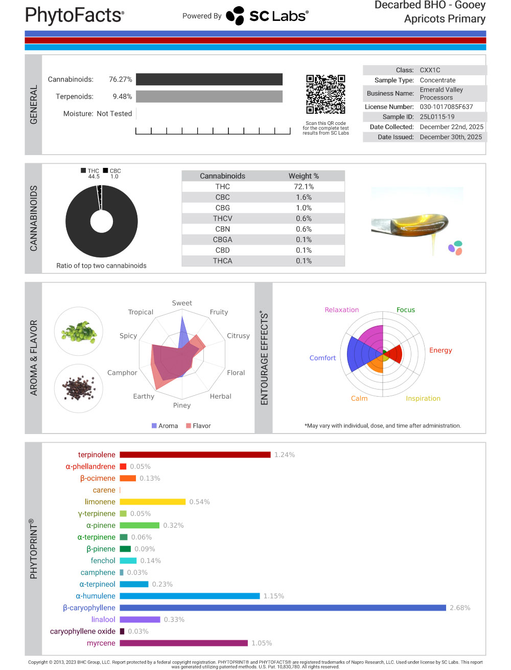 Overall, with 76% total active cannabinoids and 9.48% terpene content, Gooey Apricots by The Dope Depot leans more into terpene expression than raw potency.