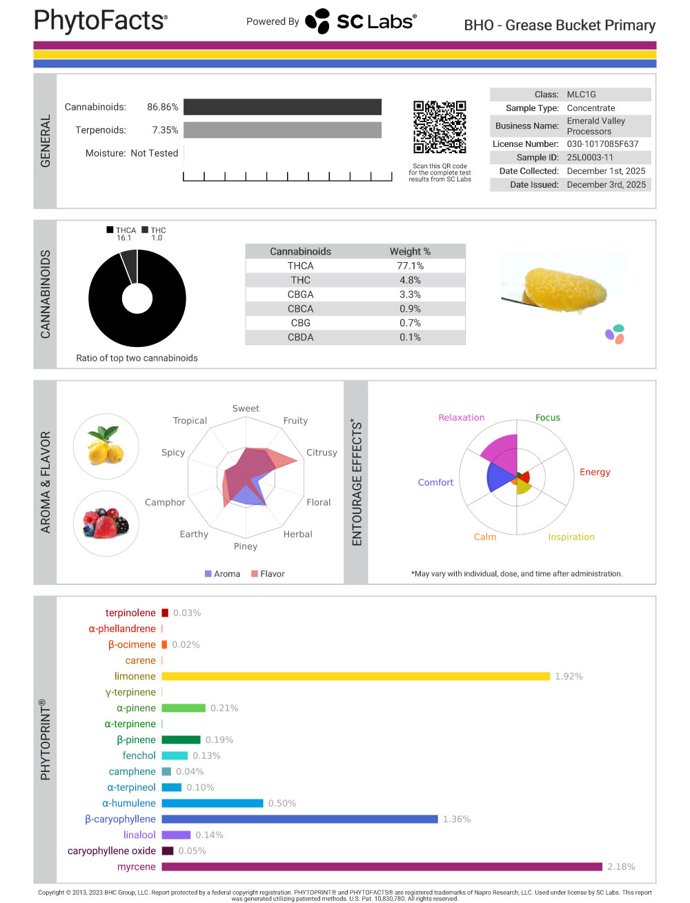 Overall, with 86% cannabinoids and 7.35% terpene content, Grease Bucket is a beautiful looking golden extract with a great cannabinoid and terpene profile. The lab rats are quite pleased with themselves on this one.