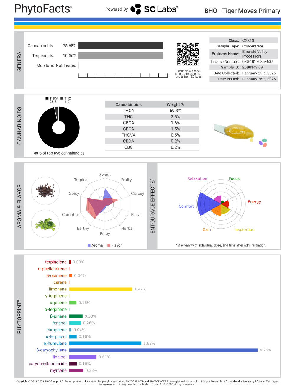 Overall, with 75% total active cannabinoids and a whopping 10.76% terpene content, Tiger Moves by The Dope Depot is a terpene-forward indica blend that balances bright citrus top notes with a deep, spicy backbone.