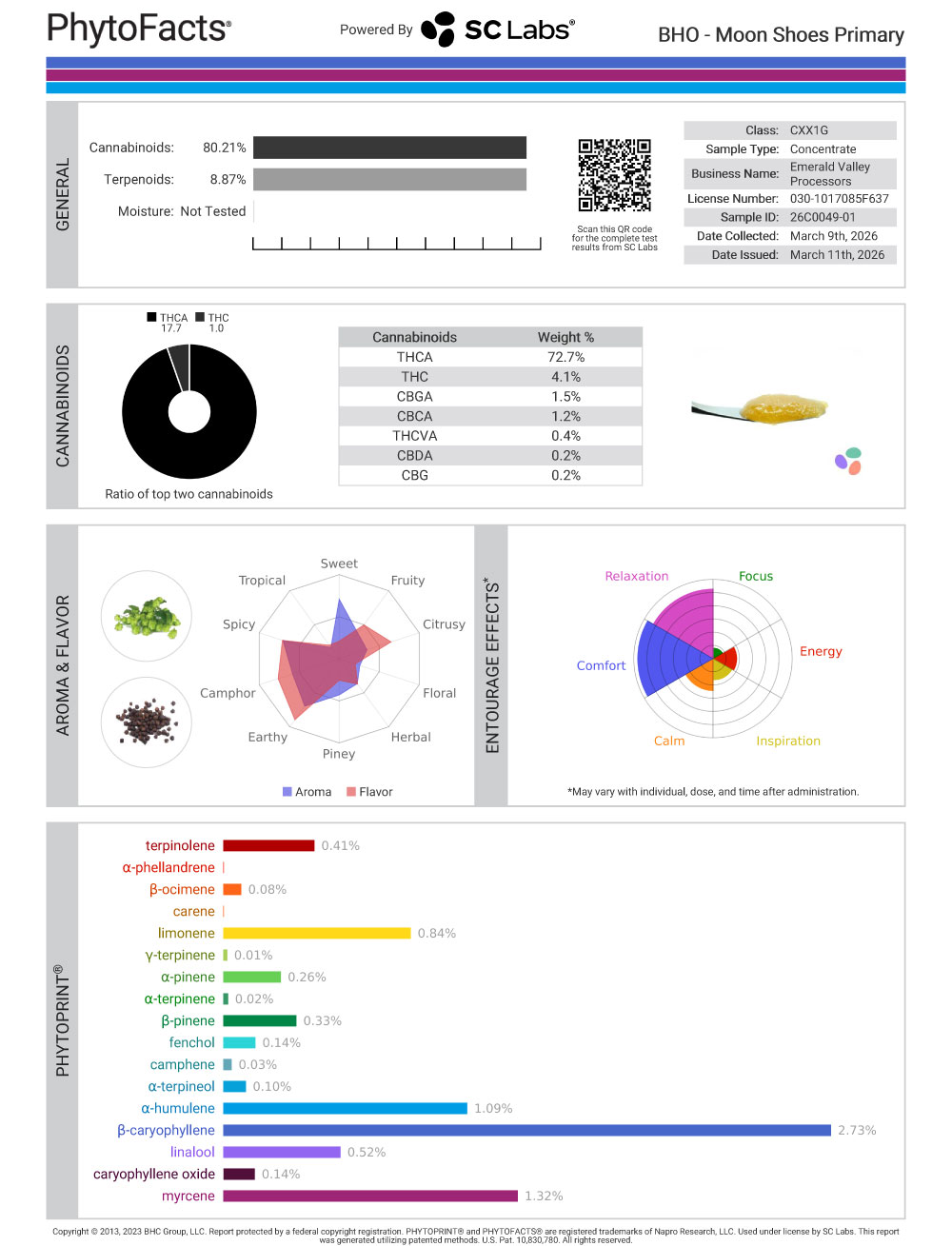 Overall, with 80% total active cannabinoids and 8.87% terpene content, Moon Shoes by The Dope Depot delivers a well-balanced hybrid extract that favors smooth citrus, subtle sweetness, and a grounded finish over loud, one-note flavor.